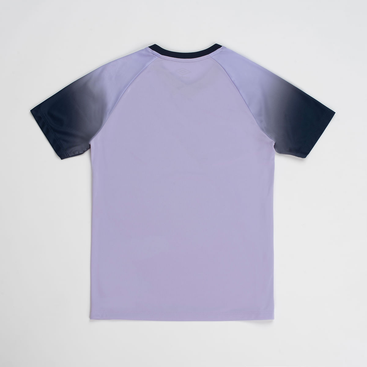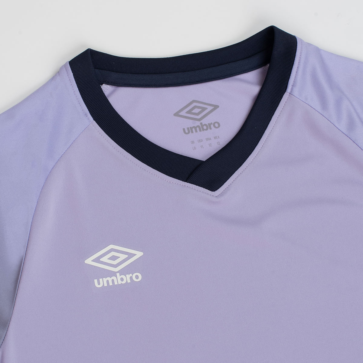 Camisa juvenil confeccionada em malha 100% poliéster, indicada para a prática de esportes. Modelagem regular com gola V transpassada em ribana e manga curta raglan. Possui arte gráfica com efeito degradê sublimada nas mangas, cavas e gola pespontadas e logo Umbro em termo à base d’água aplicado na parte frontal.