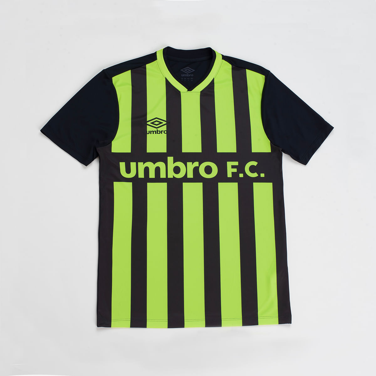Camisa juvenil confeccionada em malha 100% poliéster, indicada para a prática de esportes. Modelagem regular com gola V estilizada bicolor em ribana e manga curta. Possui estampa listrada frontal sublimada com maxi logo Umbro Letter FC centralizado e logo Umbro em termo à base d’água aplicado na parte frontal direita superior.