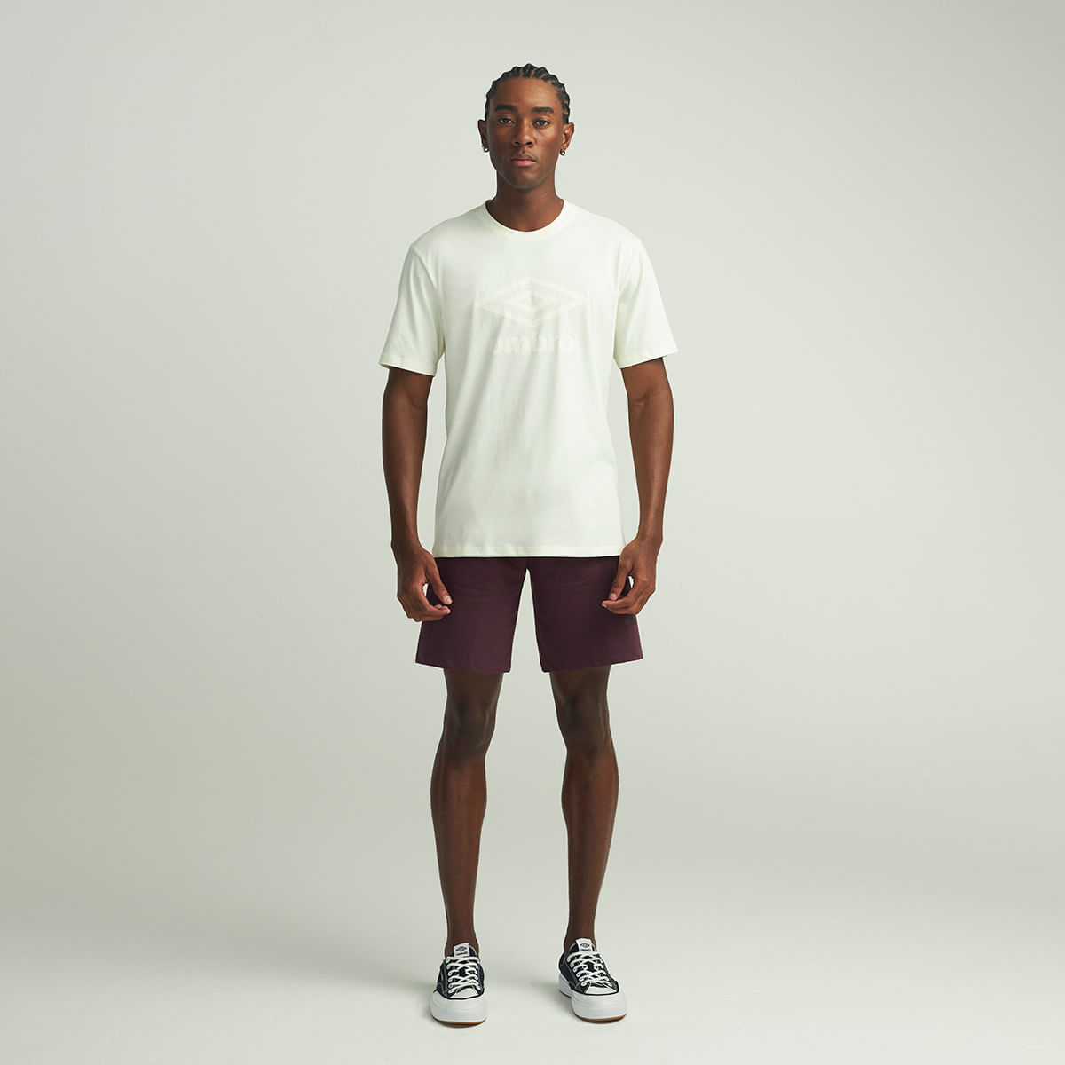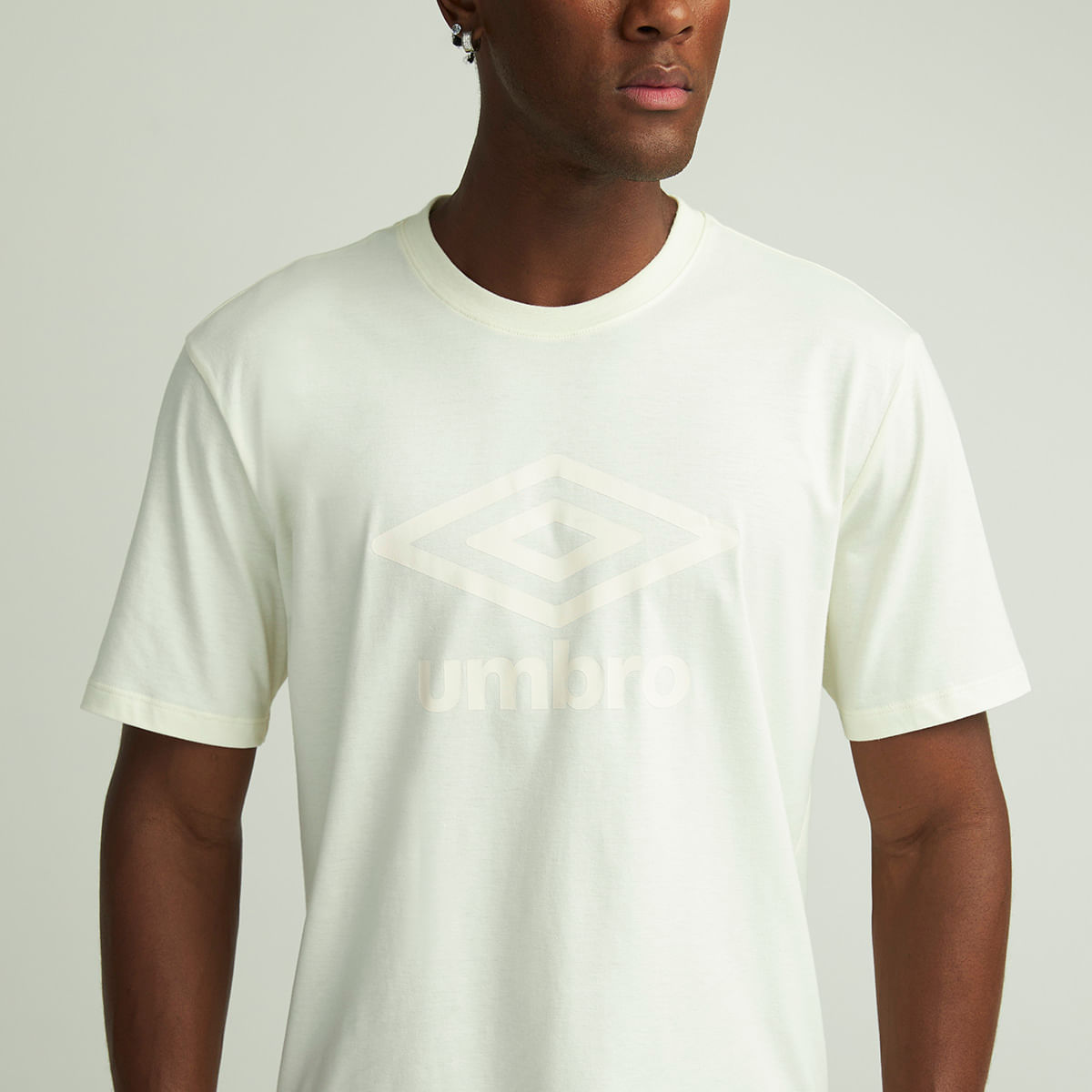 Camiseta masculina feita em meia malha de algodão. A peça possui modelagem relax com cavas deslocadas, gola careca em ribana e maxi logo Umbro em silk na parte frontal.