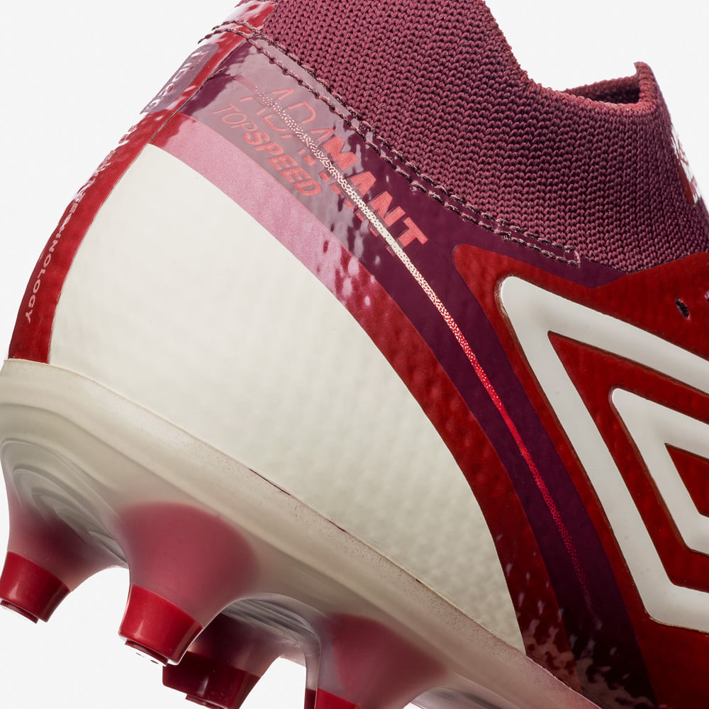 A Chuteira Campo Adamant Top Speed Pro é um modelo profissional ultraleve com foco em alto rendimento. Seu cabedal combina materiais como knit, TPU e tecnologia Diamond Grip para melhorar o controle nos chutes e passes. A palmilha anatômica em EVA e o solado de campo FG de 11 travas mistas (cônicas e setas), com ponteiras em TPU, é produzido em Pebax translúcido que oferece retorno de energia e reforço na área do enfranque.
