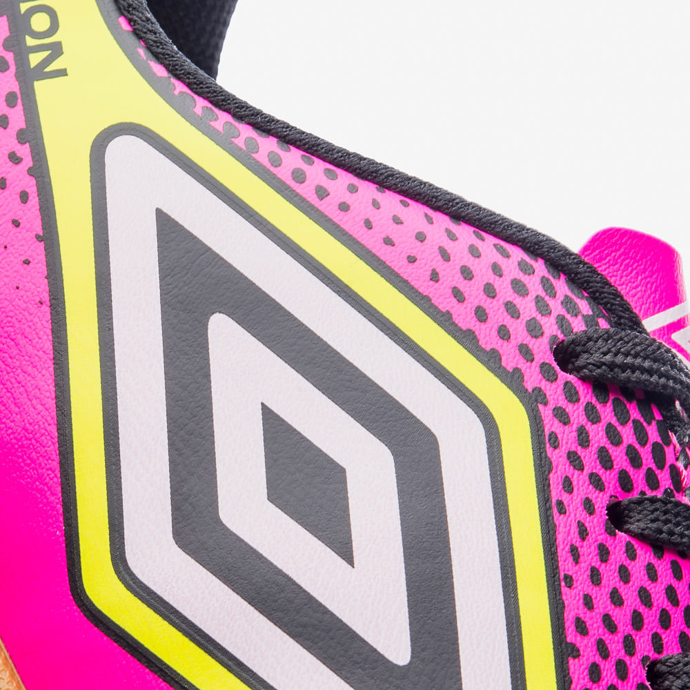 Seu cabedal é construído em material sintético laminado com aplicação de grafismo reticulado e forro em tecido de poliéster. Possui Diamante Umbro na lateral estilizado com a assinatura do modelo, atacador convencional e palmilha interna em EVA forrado. Em blenda de TPU e PVC, a sola é colada diretamente no cabedal, garantindo mais durabilidade e resistência na hora do jogo.