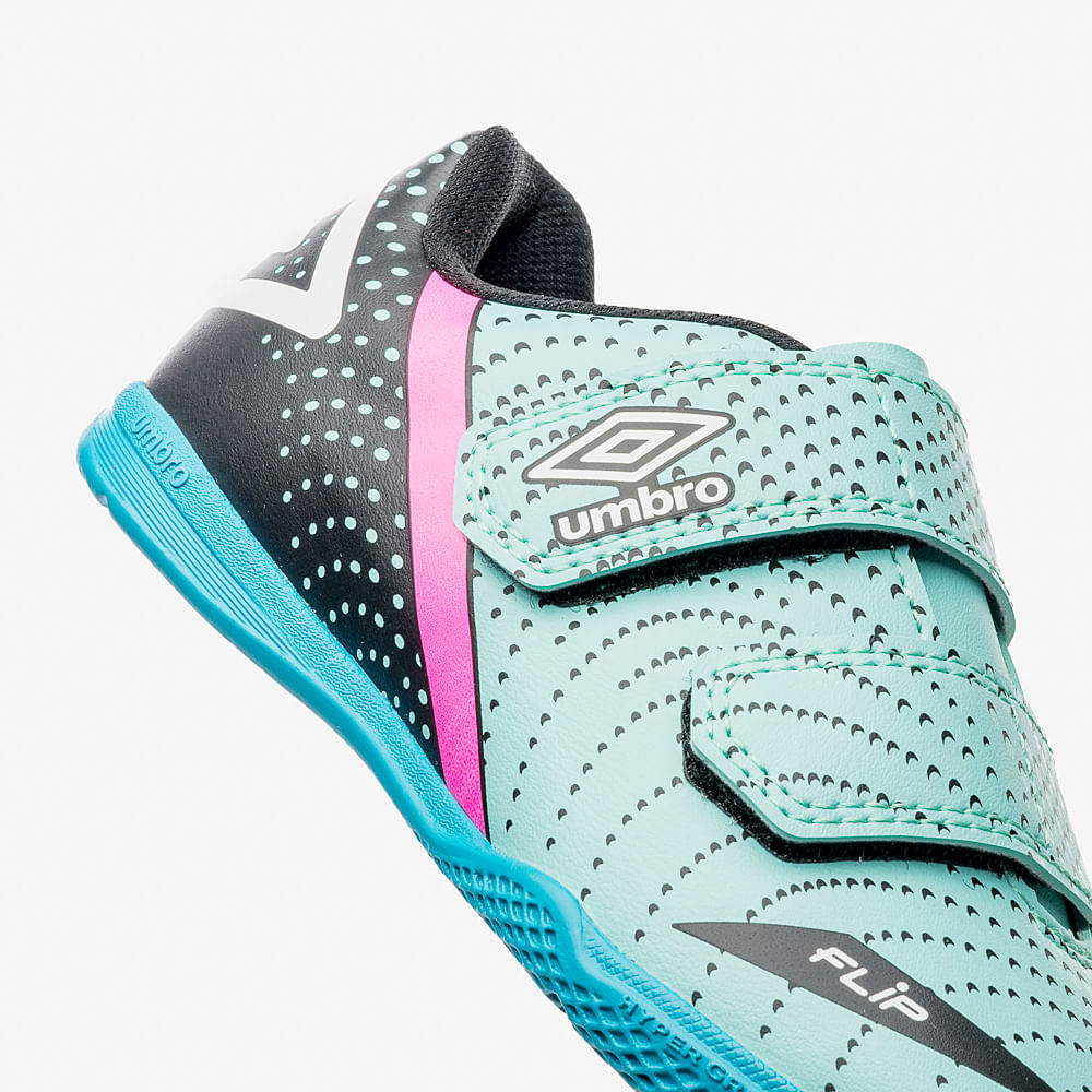 A Chuteira Futsal Umbro Flip Kids foi desenvolvida especialmente para os pequenos jogadores. Com fechamento duplo em velcro, proporciona praticidade e agilidade no calce. O cabedal em material laminado de fácil manutenção exibe grafismos com ilusão de ótica, transmitindo sensação de movimento. O Diamante Umbro é aplicado na parte traseira, enquanto a palmilha em EVA forrado oferece conforto. O solado de borracha colorida garante aderência e durabilidade nas quadras.
