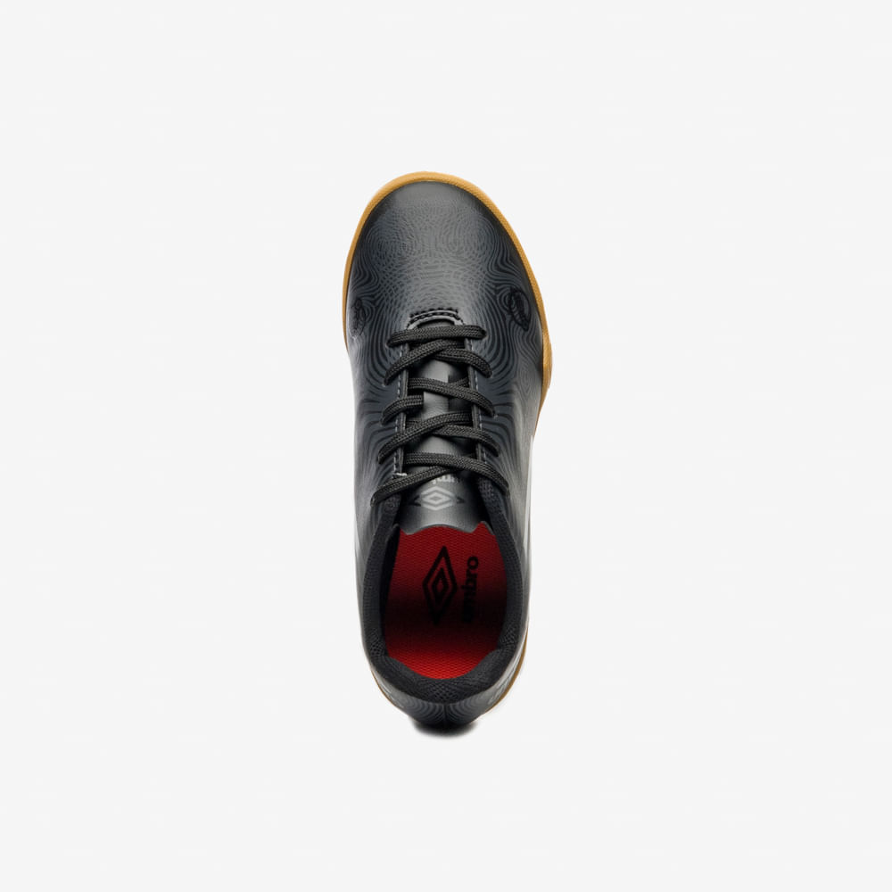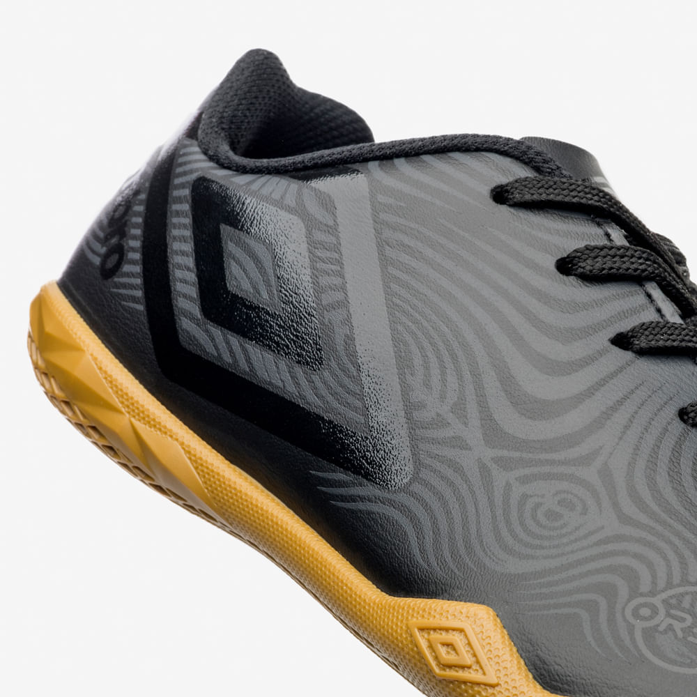 Cabedal confeccionado em material laminado com design inspirado no modelo Adamant. Possui aplicação de grafismo exclusivo em serigrafia com duas cores, Diamante Umbro inclinado em destaque na lateral, assinatura Orbit na parte frontal e palmilha macia em EVA com poliéster forrado. O solado de futebol indoor é construído em blenda de TPU com PVC para maior aderência.