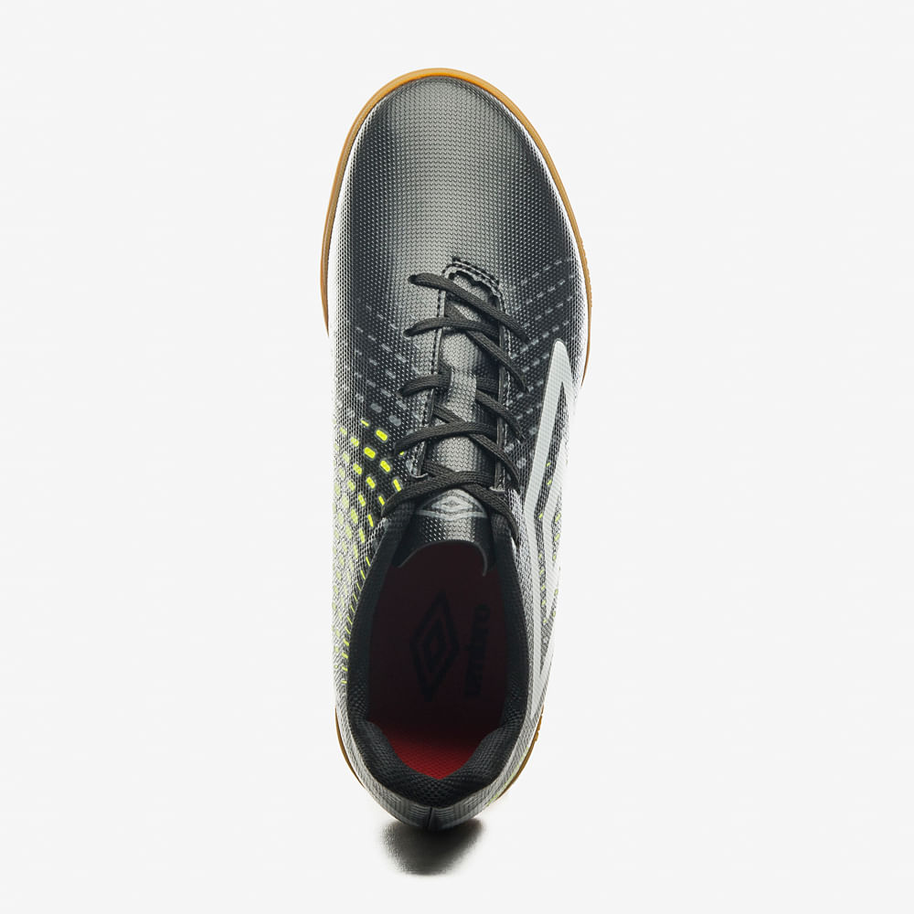 Cabedal (parte superior do calçado) construído em material sintético texturizado com acabamento laminado. Possui serigrafia de arte gráfica personalizada em degradê com sobreposição de três cores, Diamante Umbro na lateral, forro em poliéster e macia palmilha em EVA com forração de tecido. O solado de futsal é todo em borracha, proporcionando função antiderrapante e durabilidade.