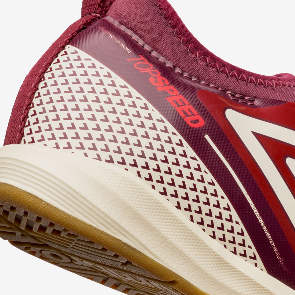 A Chuteira Futsal Umbro Top Speed League é ideal para quem busca leveza e sensibilidade no toque com a bola. O cabedal assimétrico combina colarinho em tecido com elastano e sobreposição de laminado com grafismo e Diamante Umbro lateral. Possui meia com debrum e cadarços para ajuste preciso, palmilha em EVA forrado, e solado indoor, produzido em material de borracha monocolor que conta com tecnologia HYPERGRIP e costura de reforço frontal blaqueada.