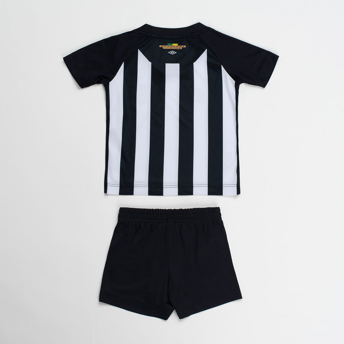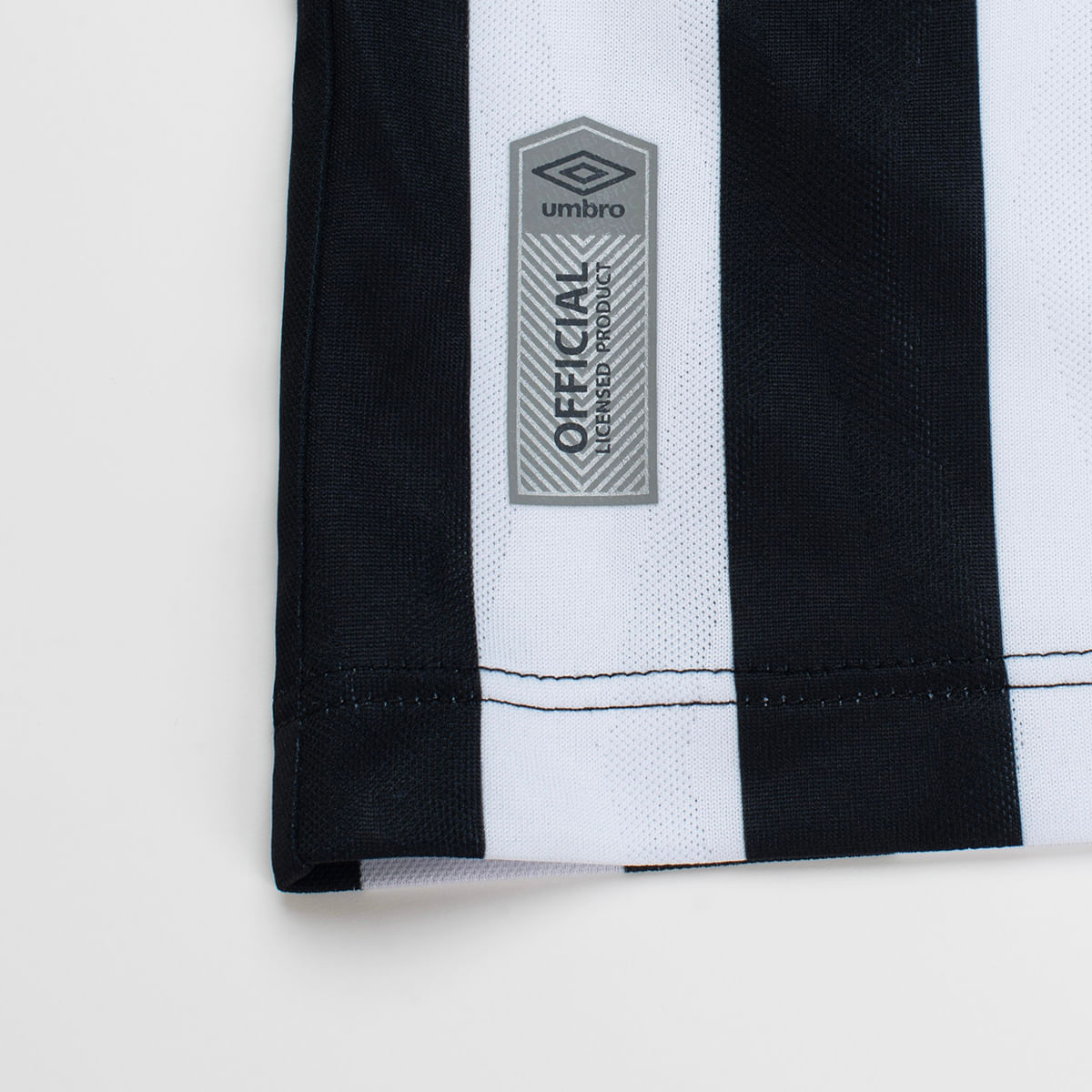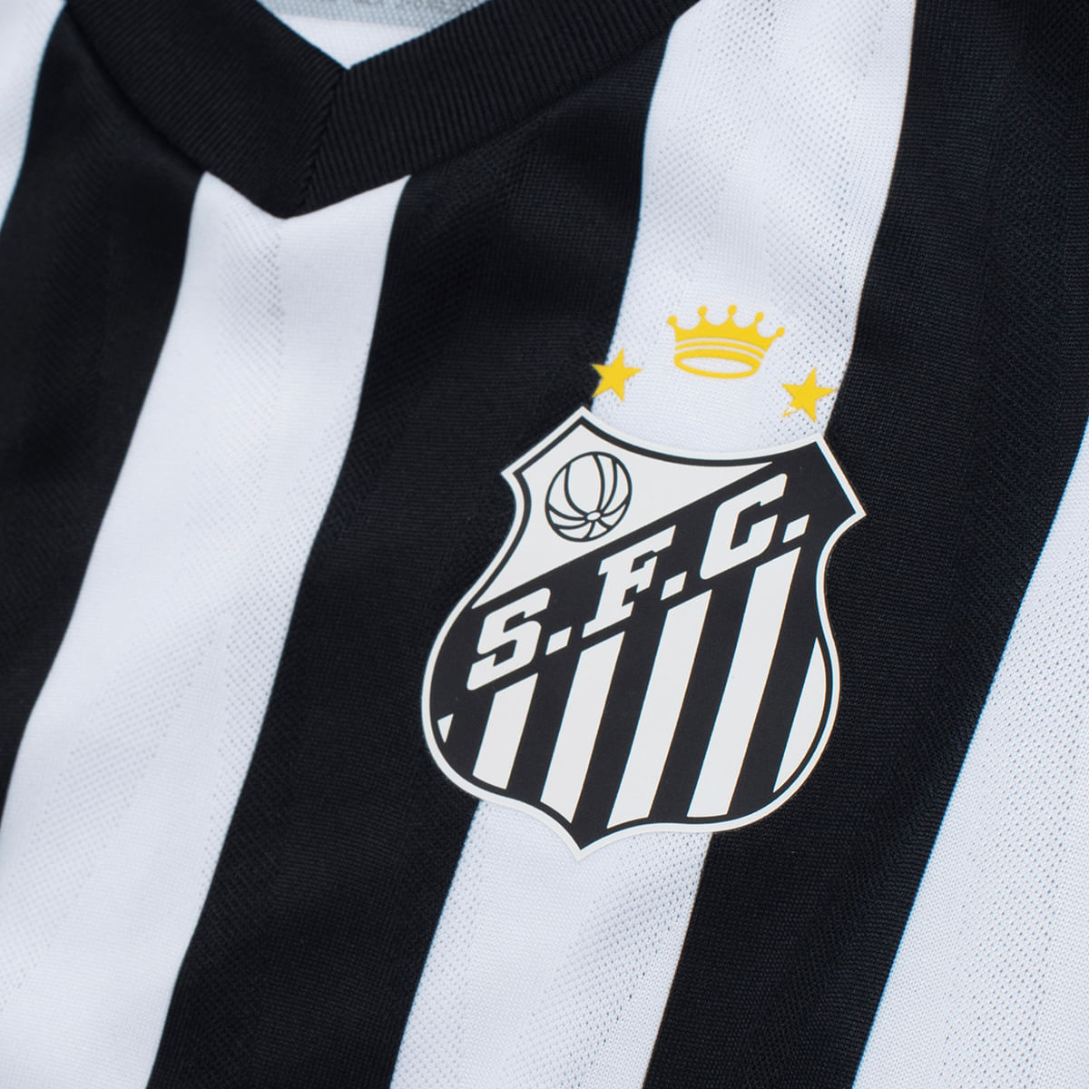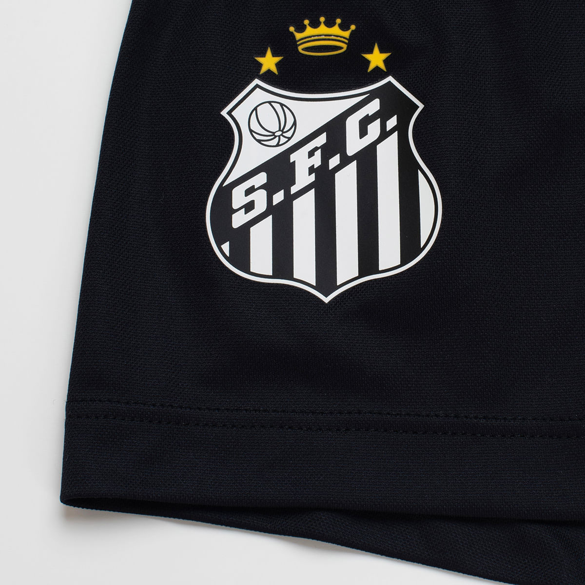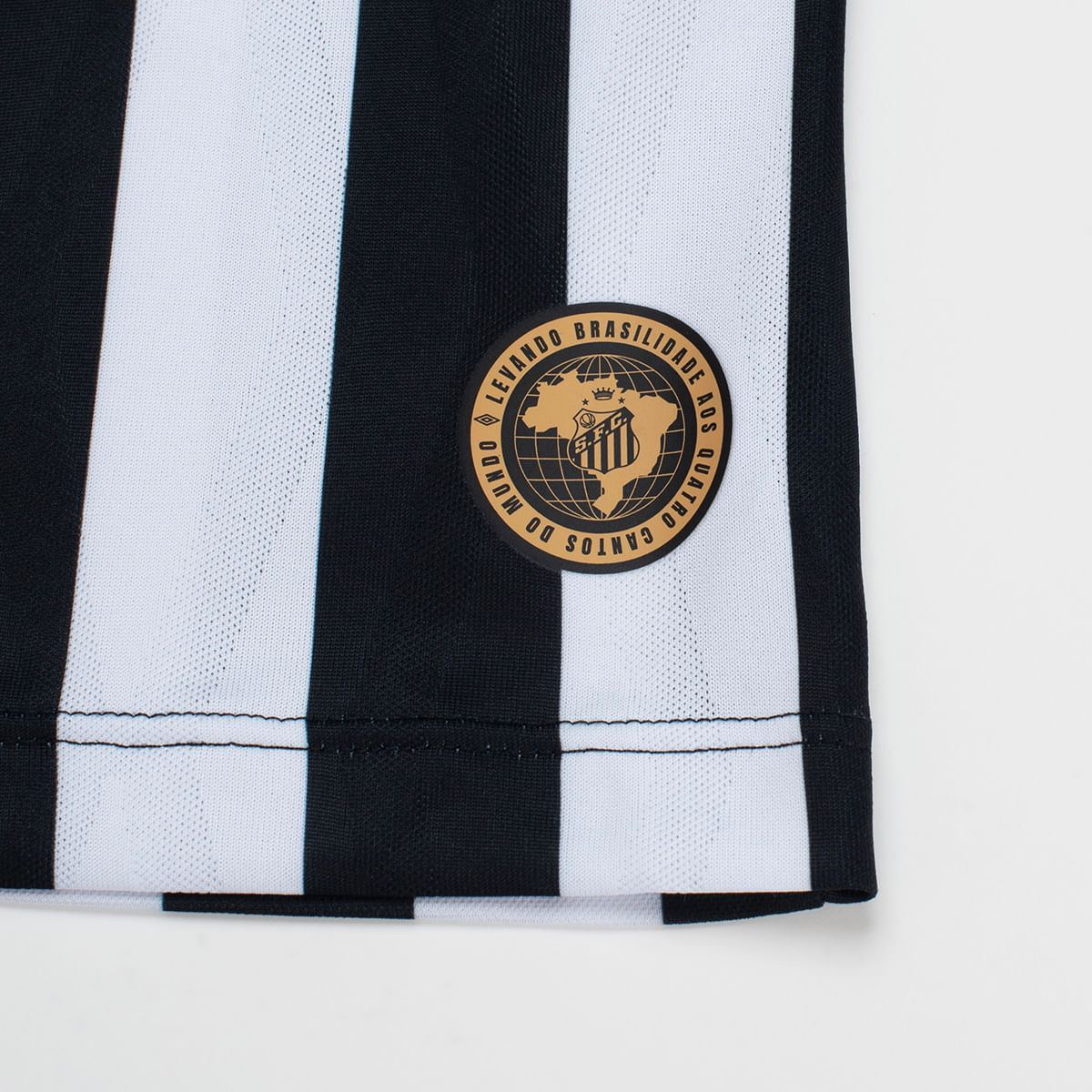 Identidade Alvinegra: escudo do Santos FC e diamante Umbro aplicados tanto na camisa quanto no calção.