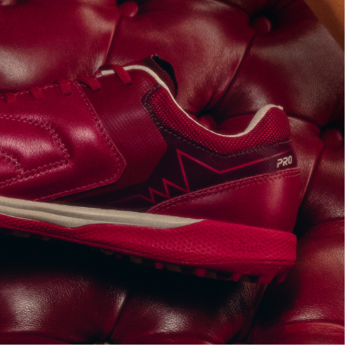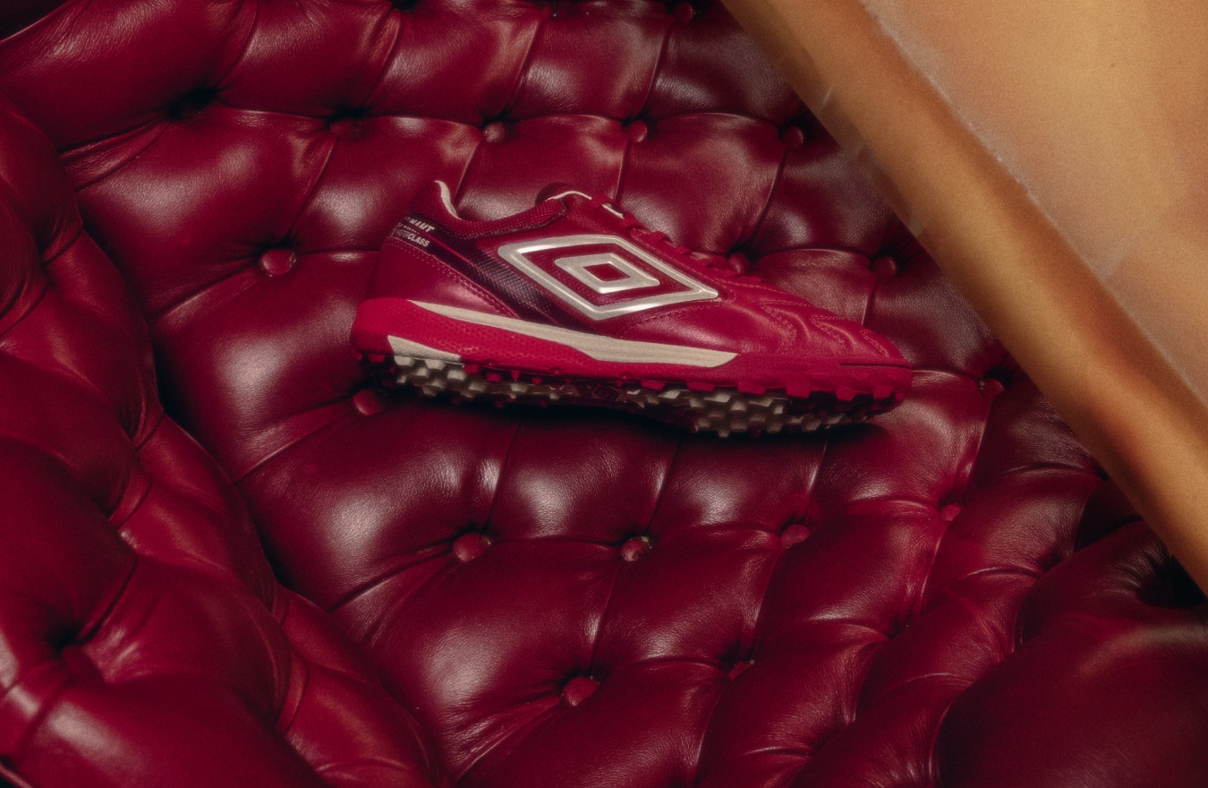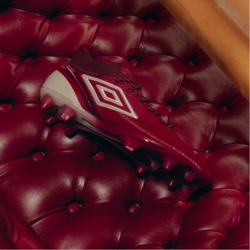 O tom profundo da chuteira vermelho cereja é aplicado às silhuetas clássicas da Umbro, garantindo um visual sofisticado que impõe respeito.